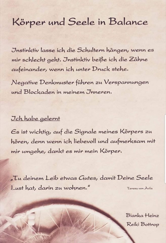 Körper und Seele in Balance 03/12/201907/06/2020 Bianka Heinz Tu Deinem Körper etwas Gutes, damit Deine Seele Lust hat darin zu wohnen.Teresa von Avila (1515-1582)